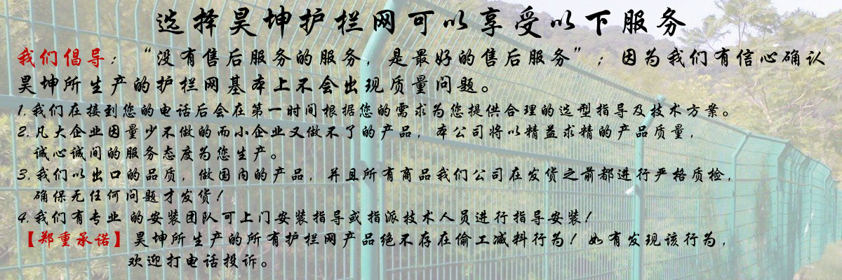 公司擁有先進的生產(chǎn)設備,高標準的表面處理技術(shù),以及嚴格的質(zhì)量管理標準。我們堅持以創(chuàng)造優(yōu)質(zhì)產(chǎn)品為理念,堅持以產(chǎn)品品質(zhì)為先,始終執(zhí)著于產(chǎn)品創(chuàng)新,努力開拓國內(nèi)外市場。公司產(chǎn)品廣泛應用于工業(yè)園區(qū)圍墻防護,市政道路安全隔離,城市綠化工程等多方面領(lǐng)域,并與多家大中型建筑單位和部門建立了長期固定合作關(guān)系。